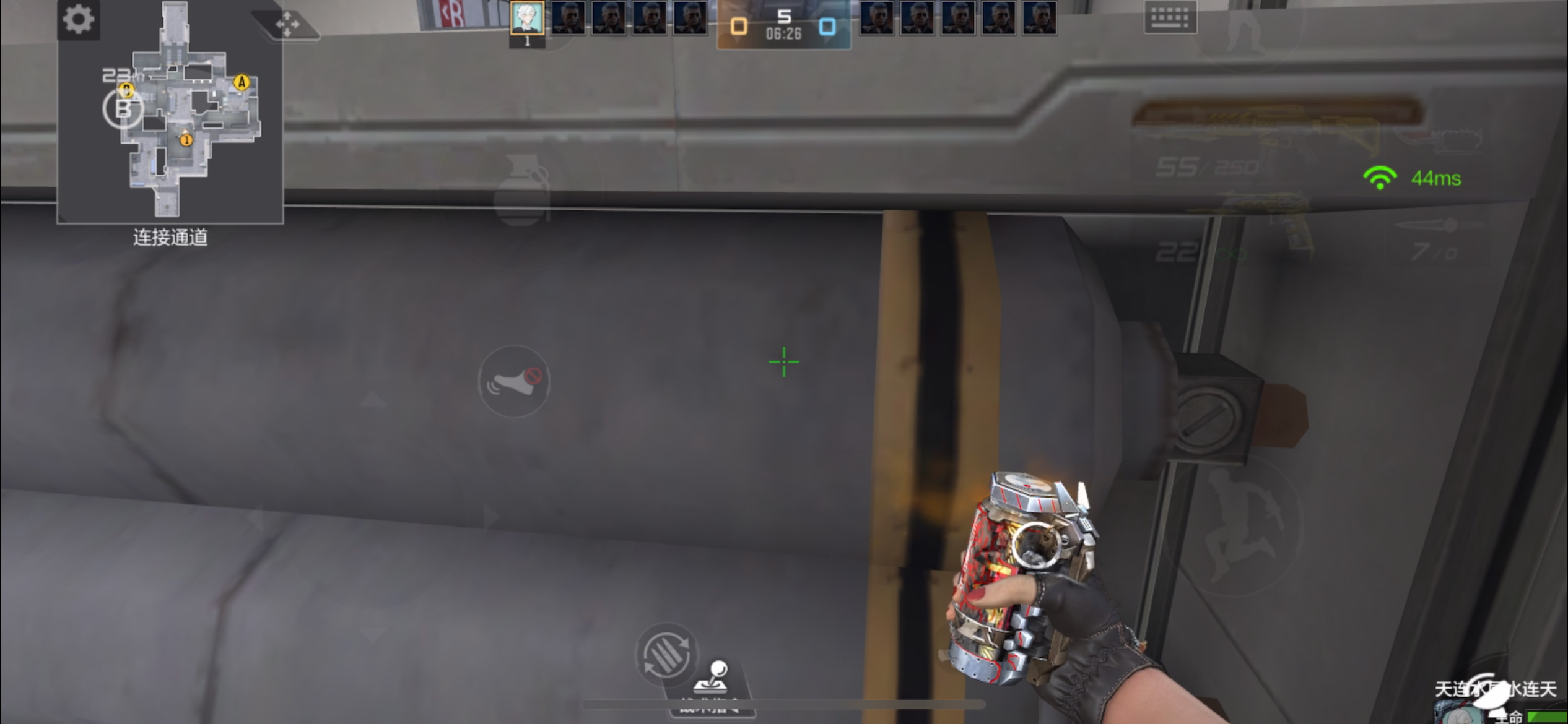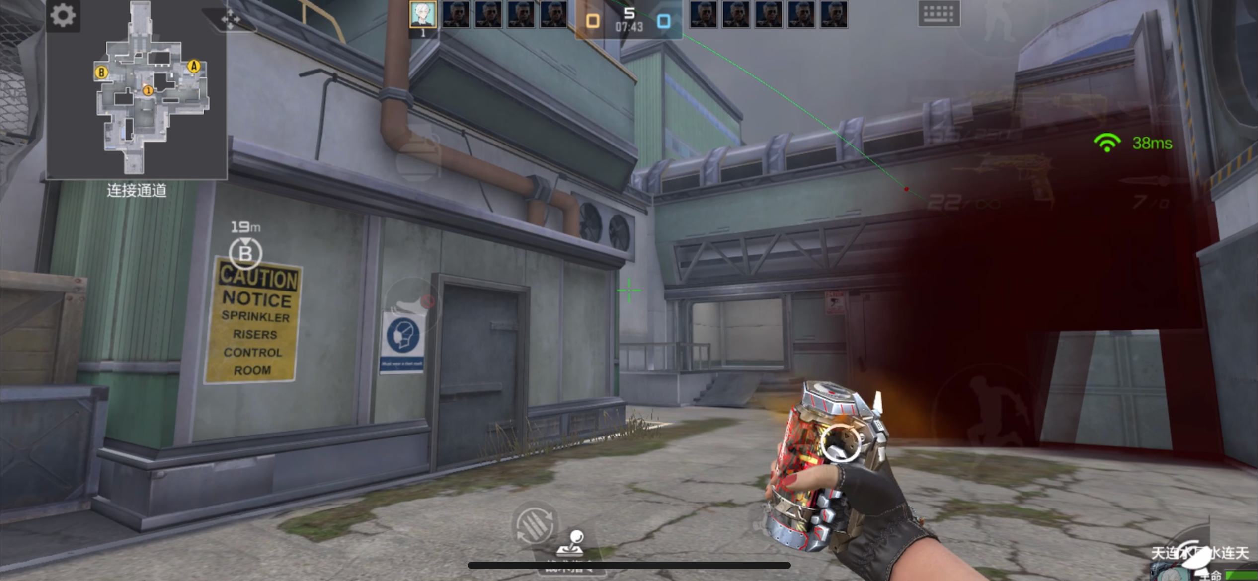 下面给大家介绍丢这颗闪的站立点位和瞄准位置。匪中厅出口边的铁箱右侧,就是丢中路同步闪的站立位置,贴着铁箱站就好了。